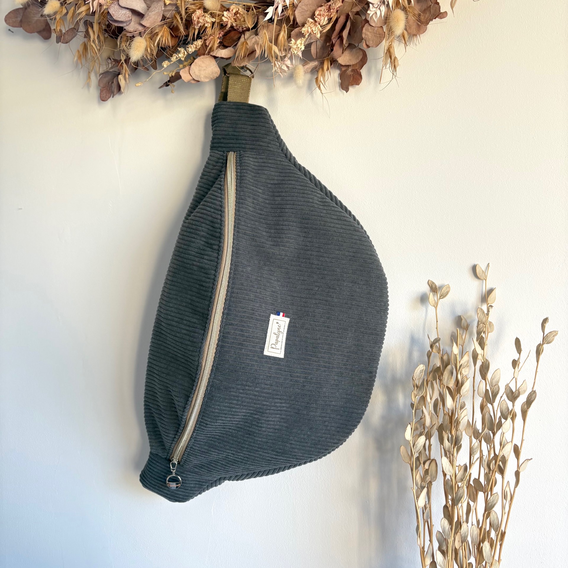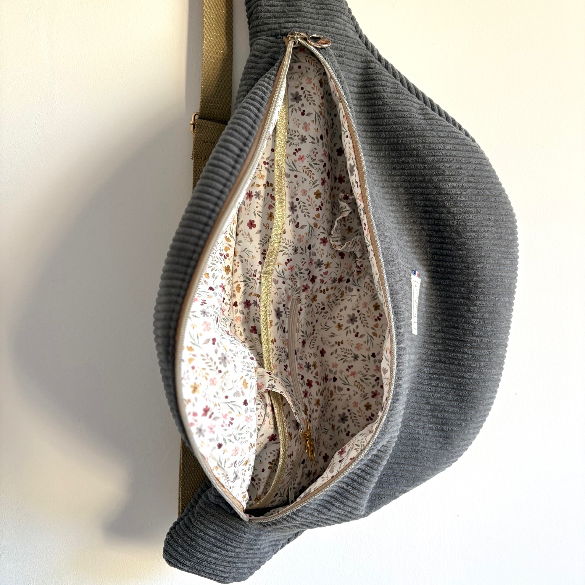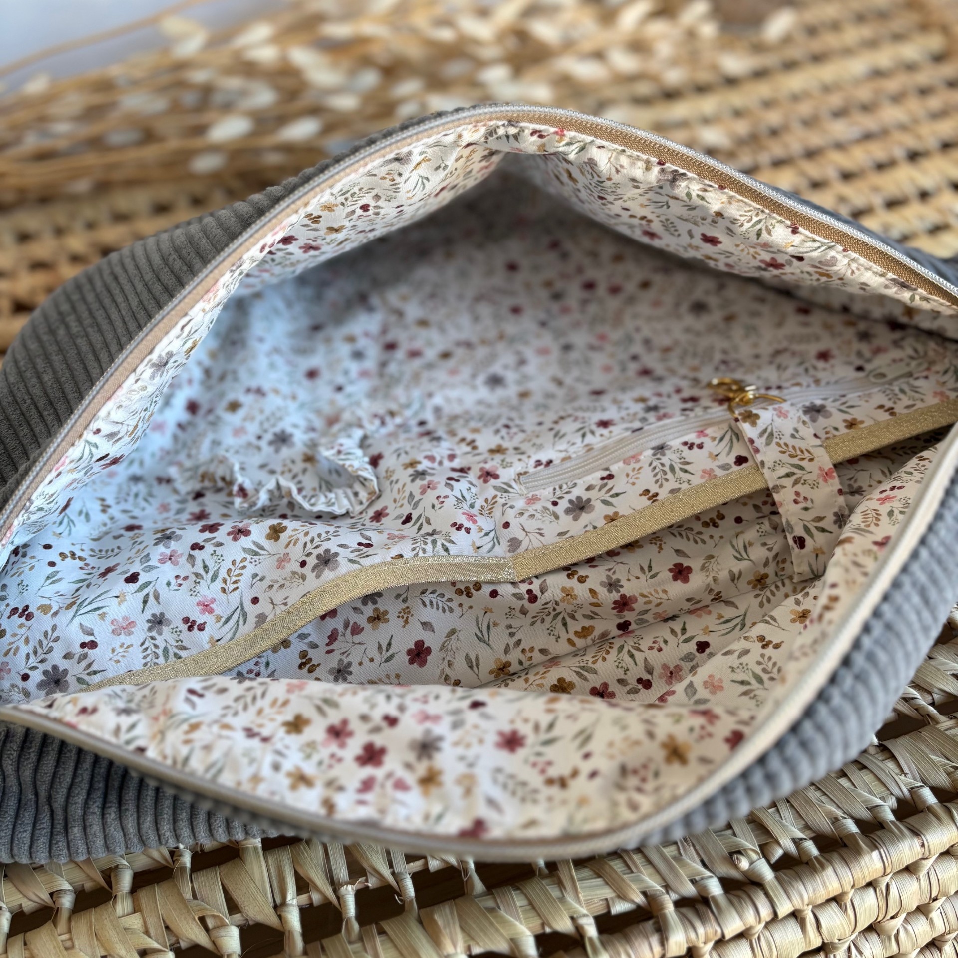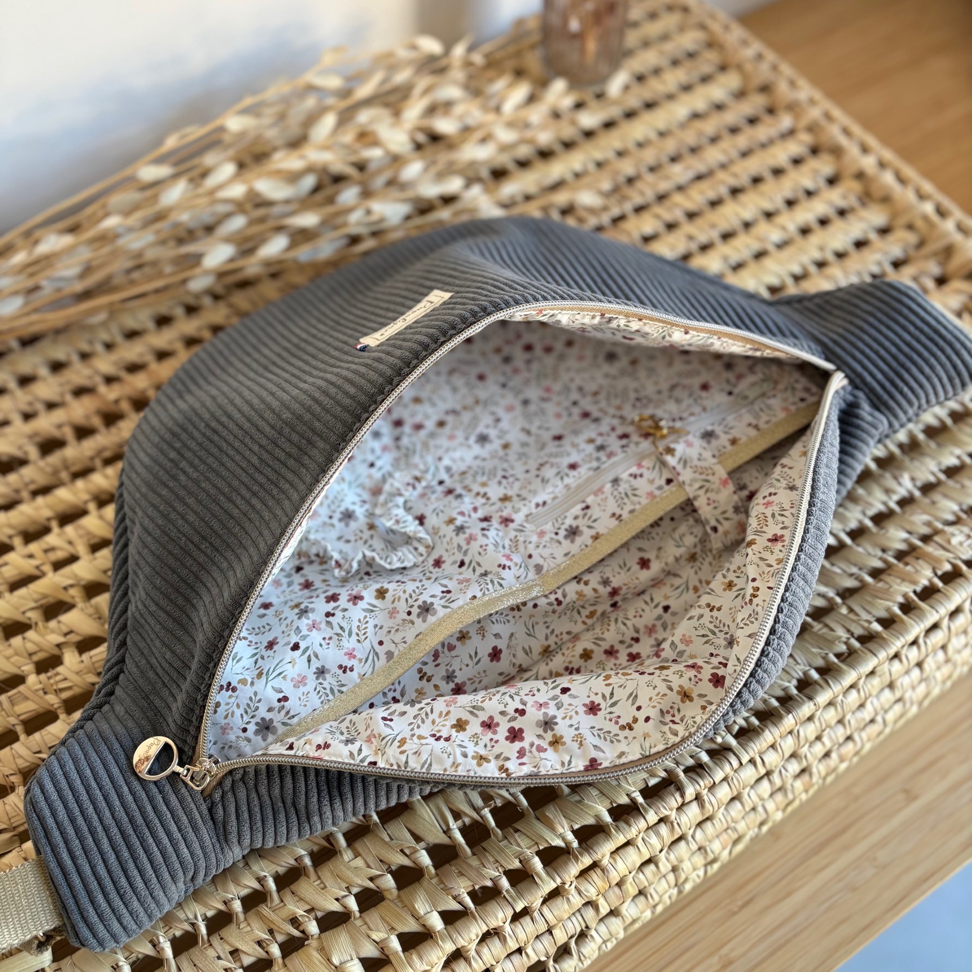 Un sac à langer version banane pour les petites sorties avec bébé (dotée de 2 poches, d’une poche zippée, d’un élastique pour supporter le biberon et d’un mousqueton pour accrocher tétine ou clés)
