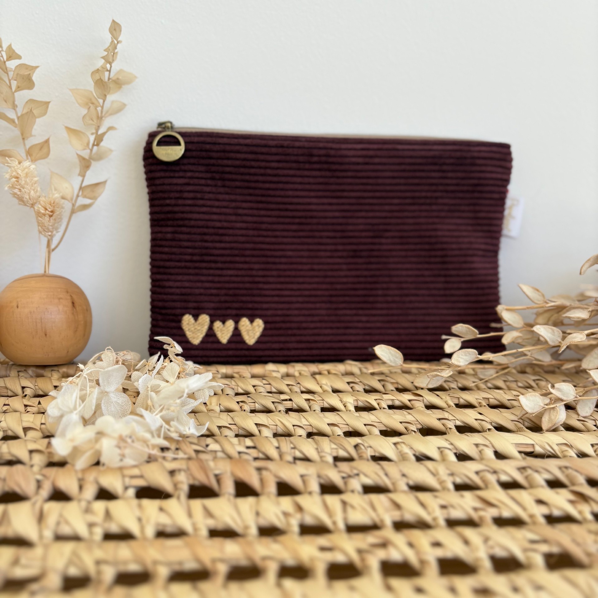 Grande pochette en Velours Cotelé Prune brodée avec 3 coeurs (rèf E.S)