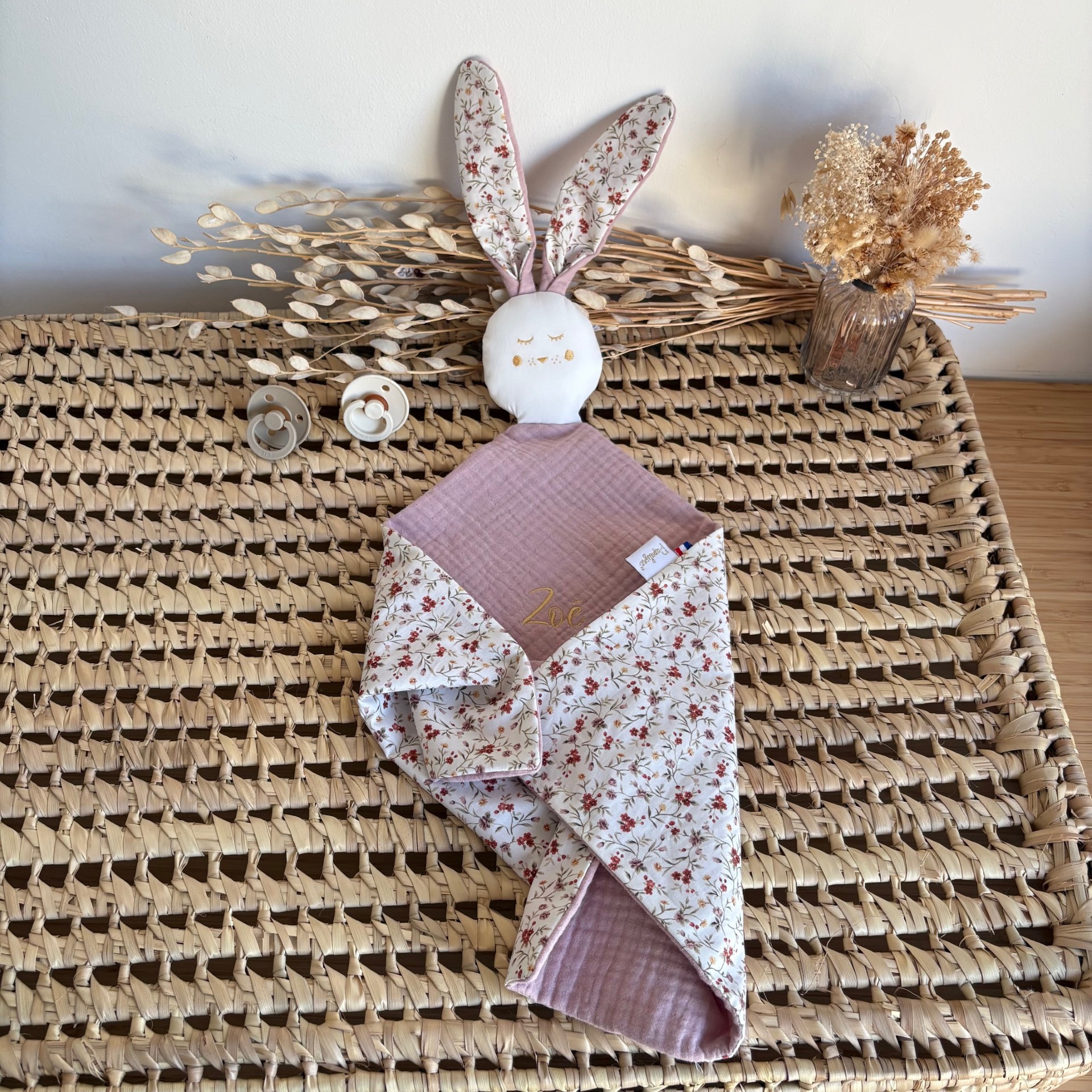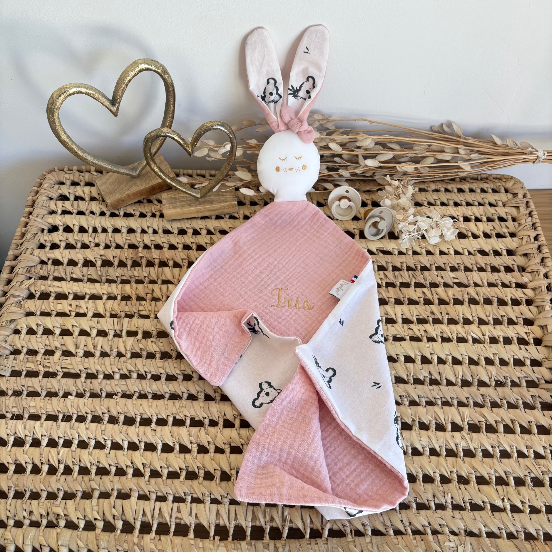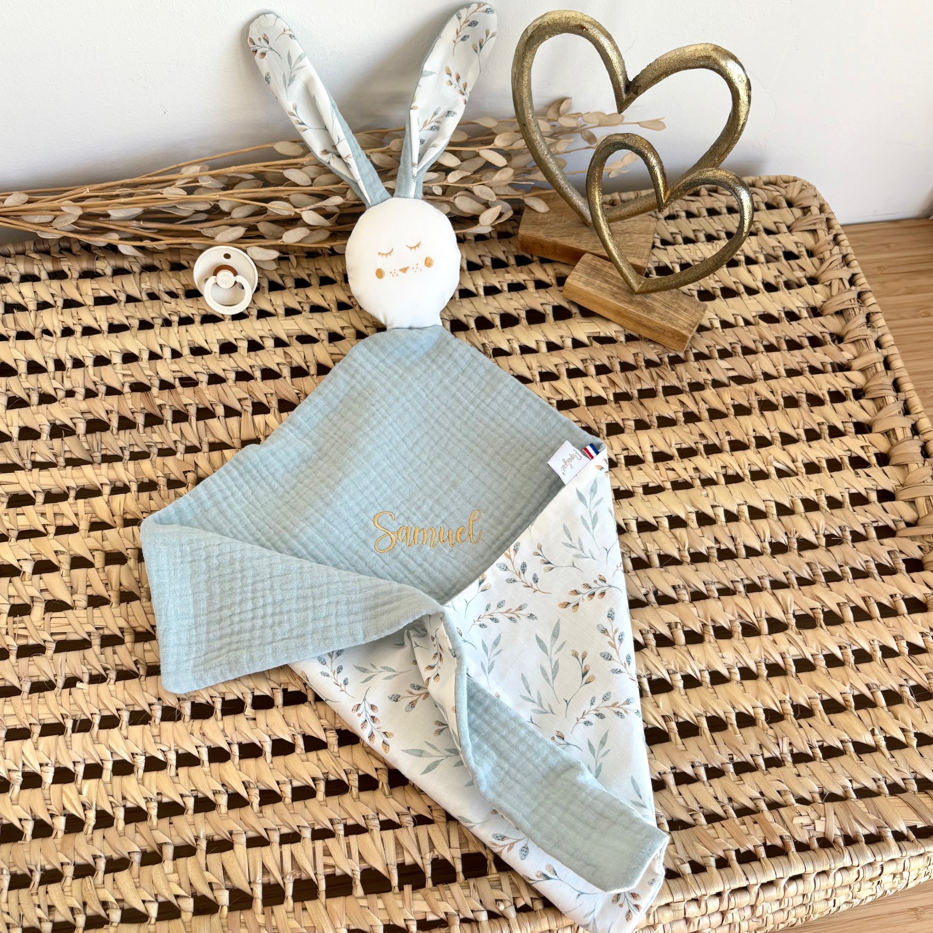 Sélectionnez la triple gaze, l’imprimé que vous souhaitez, la couleur de la broderie et créez à bébé un Papalynou unique