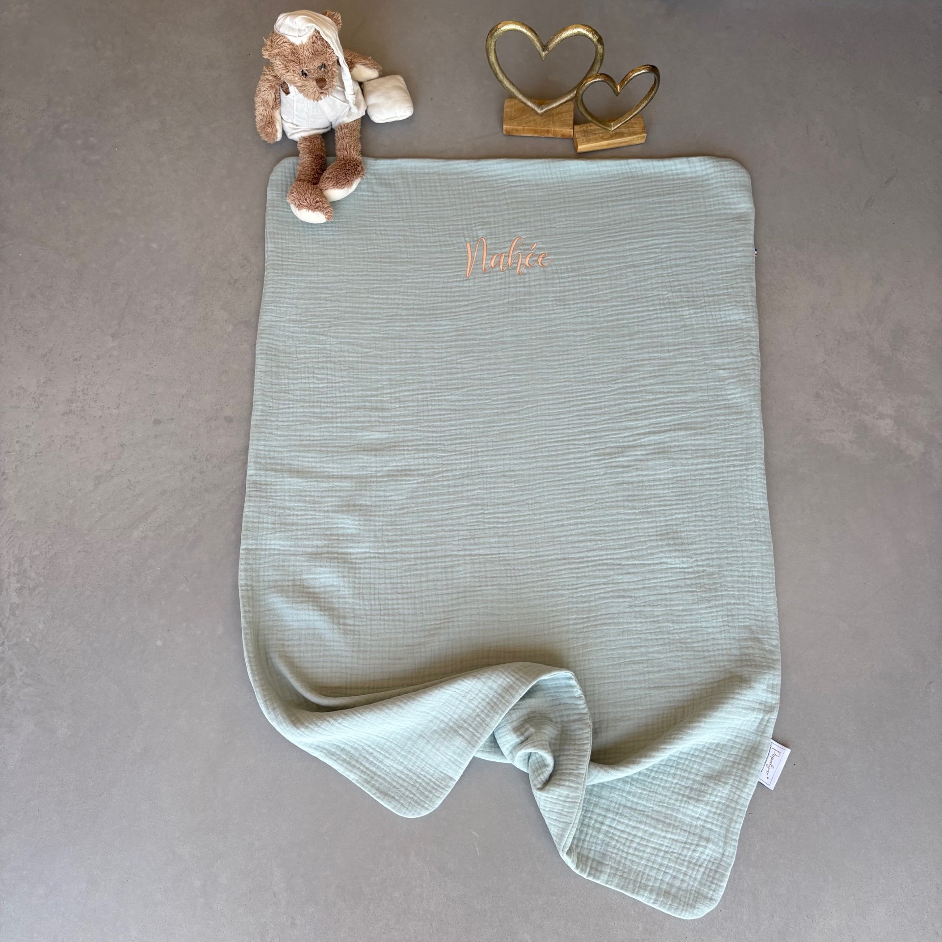 Parfaite Je cherchais une couverture légère pour les beaux jours, les soirées un peu fraîches d'été et l'automne, je l'ai trouvé et elle est venue à la maternité avec nous !! Elle est douce la couleur est égale à ce qu'on peut voir sur le site, la broderie est magnifique et notre demande de couleur a été suivie parfaitement !! Je recommande vivement et n'hésiterai pas à refaire des commandes, chose que j'ai déjà faite d'ailleurs 😊