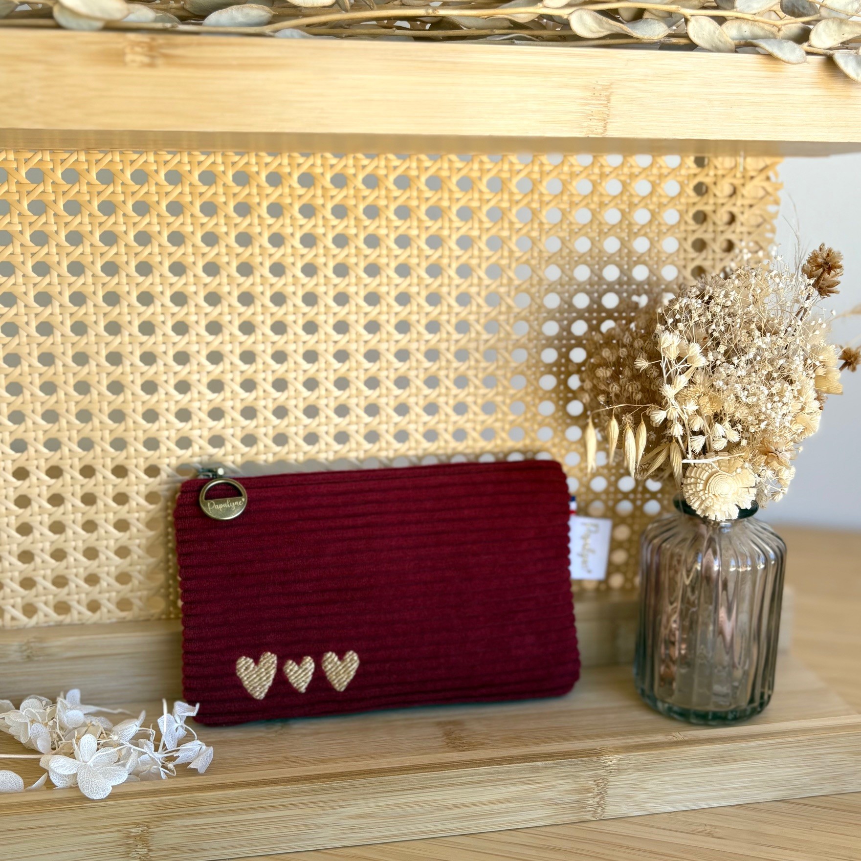 Soyez le premier à laisser un avis pour “Petite pochette en Velours Côtelé Lie de Vin brodée avec 3 cœurs (rèf E.S)”