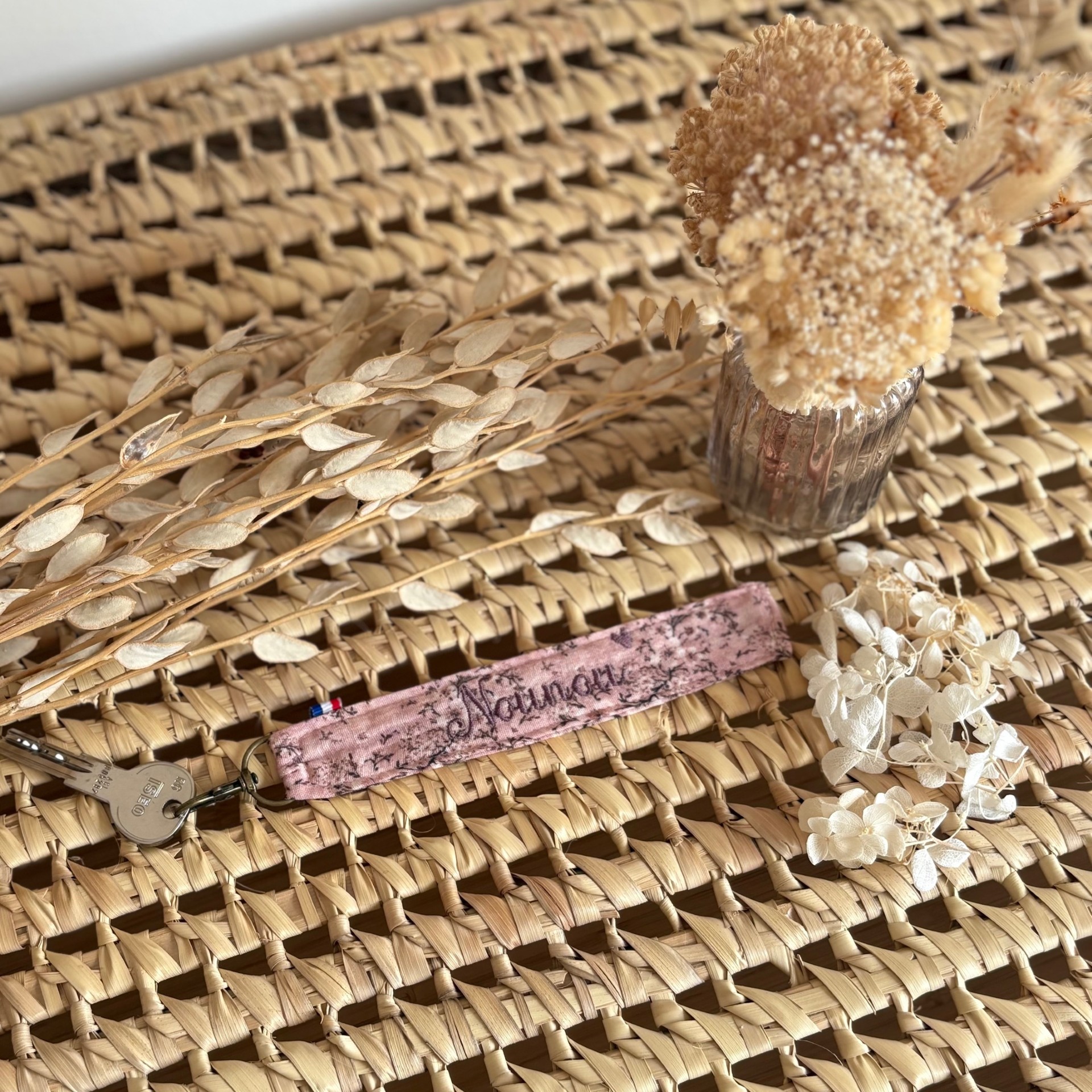 Porte Clés en Gaze de Coton Fleur du Japon brodé “Nounou”